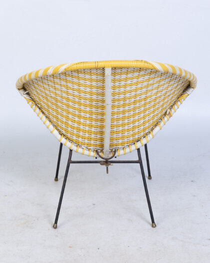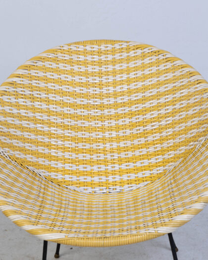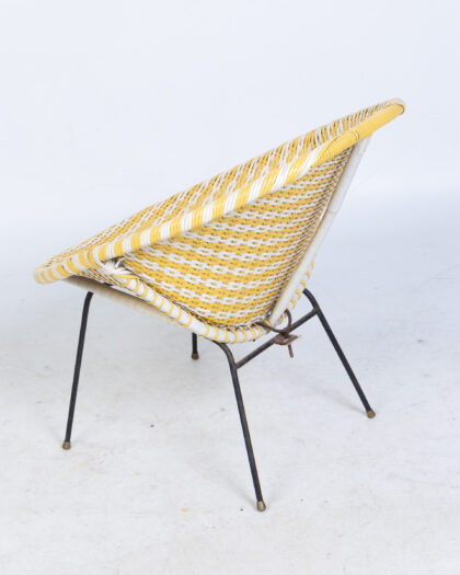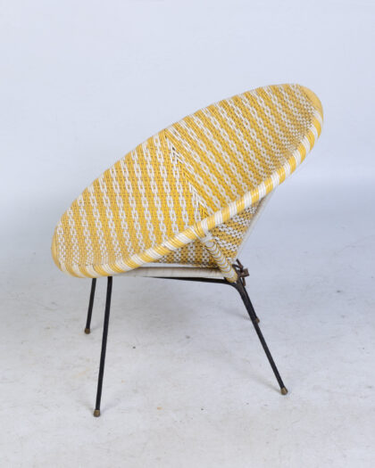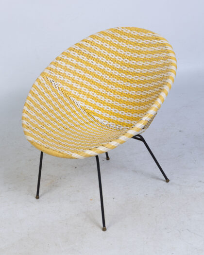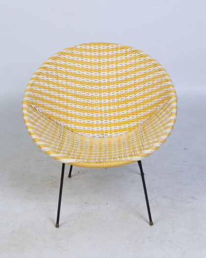 Stylish Mid-Century style chair featuring a vibrant yellow & white woven seat and sleek black metal legs, adding retro charm to any space.