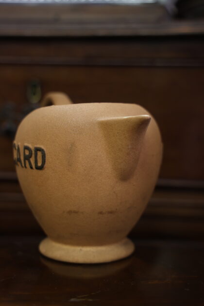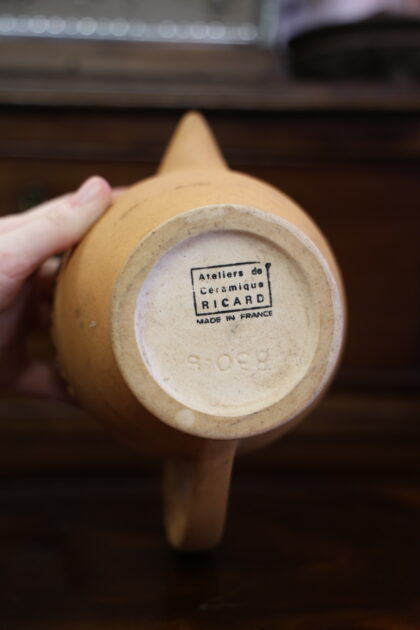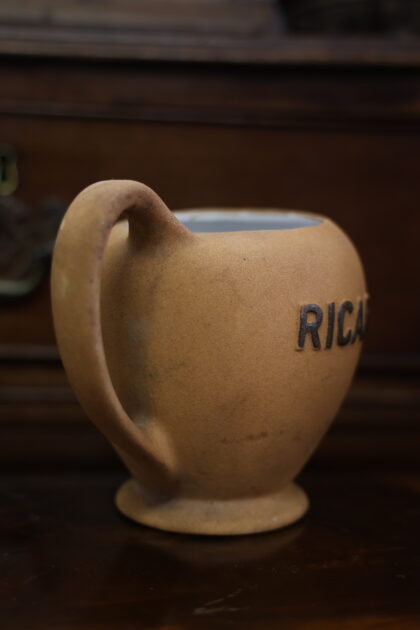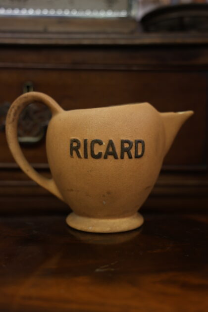 A brown ceramic jug for Ricard. Made by Ateliers de Céramique Ricard and bears black backstamp and impressed marks "830" to base.