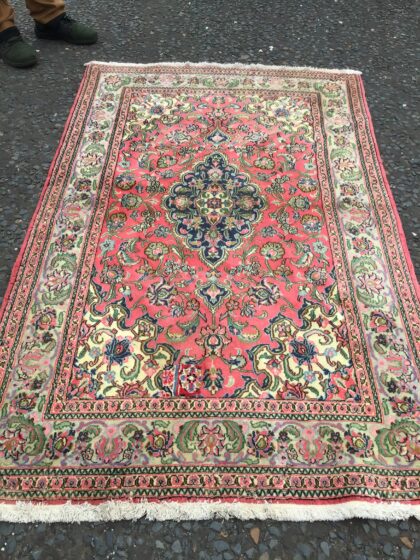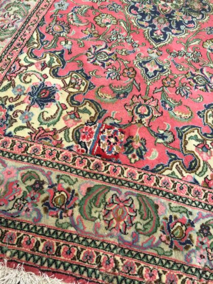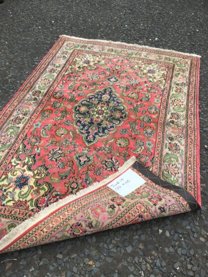 Rich pink ground fine hand-woven Persian Kashan rug with traditional floral medallion design.