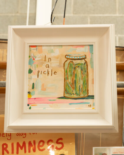 Original 'In a Pickle' painting on canvas board by Rickydrewapiccy in a white frame. A quirky and fun addition to any room. Size including frame : 48.5cm x 48.5cm