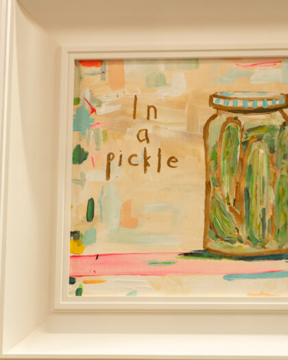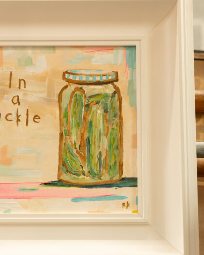 A unique and charming painting titled 'In a Pickle', created by the artist Rickydrewapiccy. The painting depicts a jar of pickles with an artistic and whimsical touch. The artwork is presented in a clean white frame, adding a touch of modern elegance to the rustic subject matter. The primary colours are green and brown, with pastel background. This piece would be a delightful addition to a kitchen, dining room, or any space in need of a playful touch.