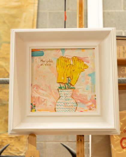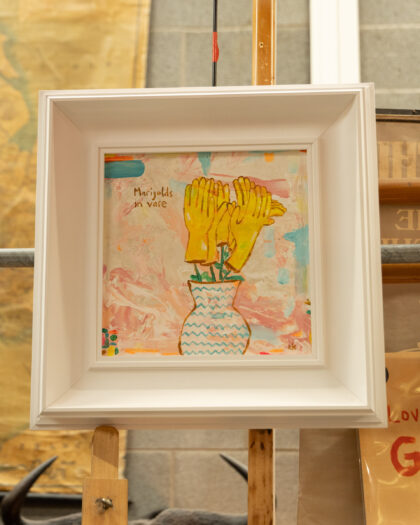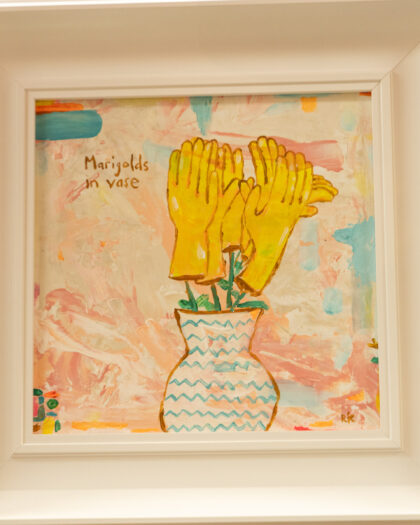 A colourful and cheerful painting by artist Rickydrewapiccy, titled 'Marigolds in vase'. The print features an abstract vase with yellow gloves standing in for marigolds, in a predominantly pink and white abstract setting. Signed by the artist 'RK' at the bottom. The painting is presented in a simple, modern white frame. This piece would brighten up any space and makes a thoughtful gift.