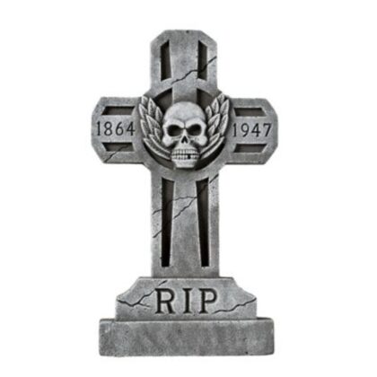 Add some spooky ambiance to your Halloween decor with this tombstone decoration. Made from durable plastic, this tombstone features a realistic stone-like finish. Features the letters 'RIP' and skull with years 1864 and 1947. Ideal for indoor or outdoor use, this decoration will help create the perfect eerie setting for your Halloween party. Easily adds a graveyard vibe to your Halloween party or haunted house. 90cm high