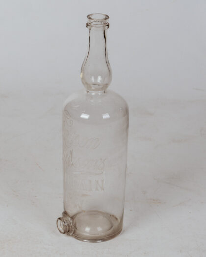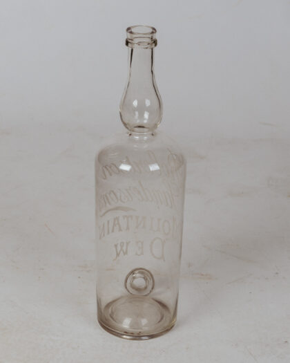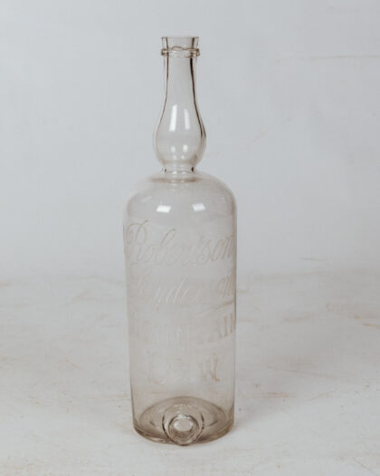 A large glass decanter in the form of a bottle with etched and enamel painted text reading, "Robertson Sanderson's Mountain Dew".