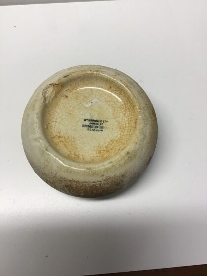 A white glazed ceramic match holder and striker. Bears black lettering which reads, "Roderick Dhu Whisky Wright & Greig Ltd. Distillers Glasgow". Made by Wm Brownlie Ltd. James St. Bridgeton Cross Glasgow and bears black backstamp to base.