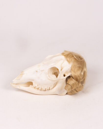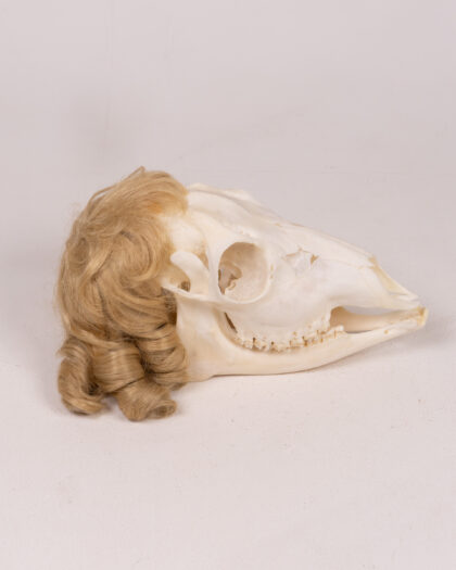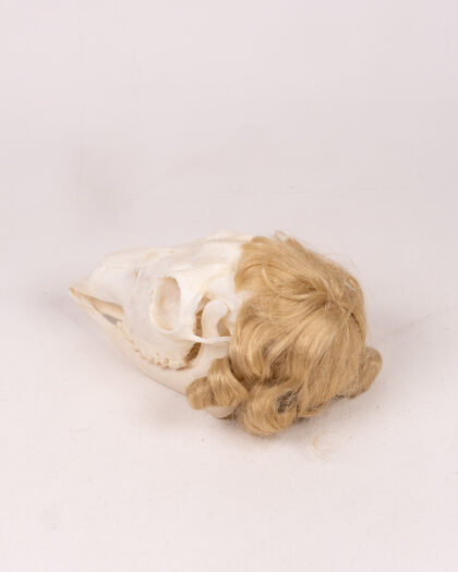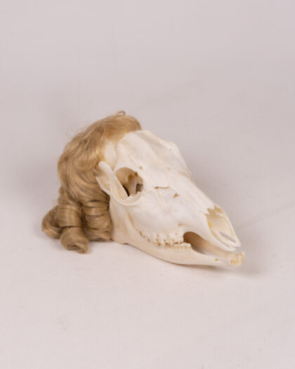 This is a real Roe Doe skull, decorated with a blonde wig. The skull is cream, while the wig is blonde. The bone is in a weathered state. This skull would make a talking point in any room and a striking decorative item. A great gift for the unusual collector. The skull has some natural imperfections and discolouration, adding to its character. Please see images.