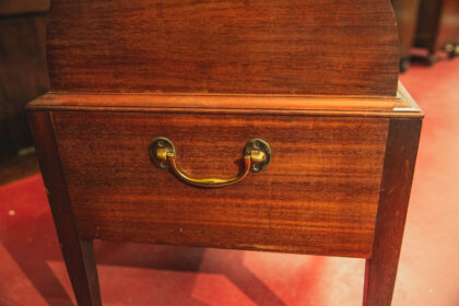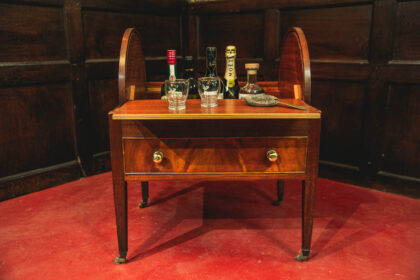 A small wooden drinks cabinet with roll-top lid and fold-out shelf. Set on castors.