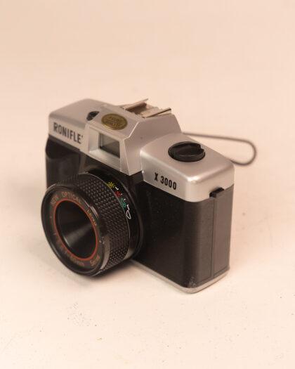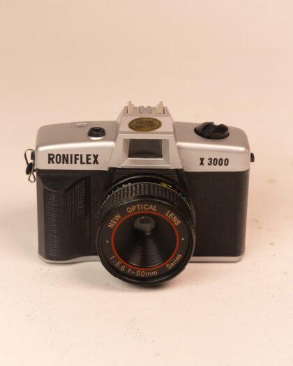 This is a classic Roniflex X3000 camera, equipped with a 1:5.6 f=50mm New Optical Lens. It is a collectible item perfect for photography enthusiasts or as a decorative piece. The camera showcases a retro design with a silver and black finish. This item has not been tested, we cannot verify if it is working or not and is sold as a prop only. Ideal for display purposes or as part of a vintage camera collection.