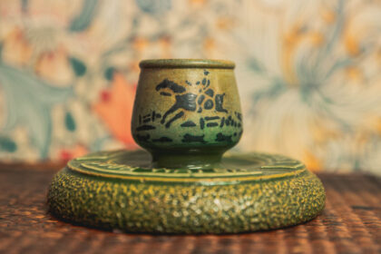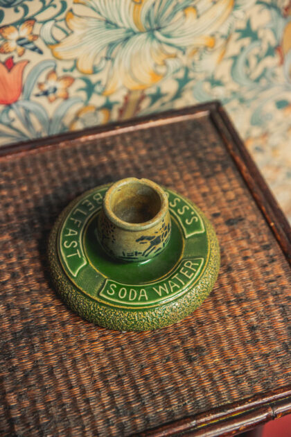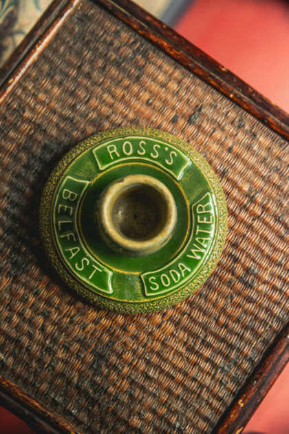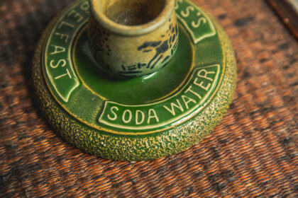 A green glazed ceramic match holder and striker for Ross's Belfast Soda Water. Bears impressed lettering to base, "Leadless Glaze" and, "Lovett Langley Mill England".