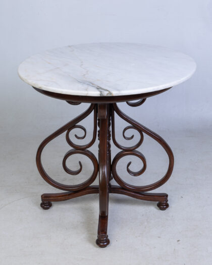 Elegant round table featuring a white marble top and an ornate bentwood base in a dark brown finish. The base has a distinctive design with curved legs and a central decorative element. This vintage-style table adds a touch of sophistication to any room and could be perfect for a restaurant or bar!