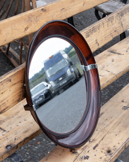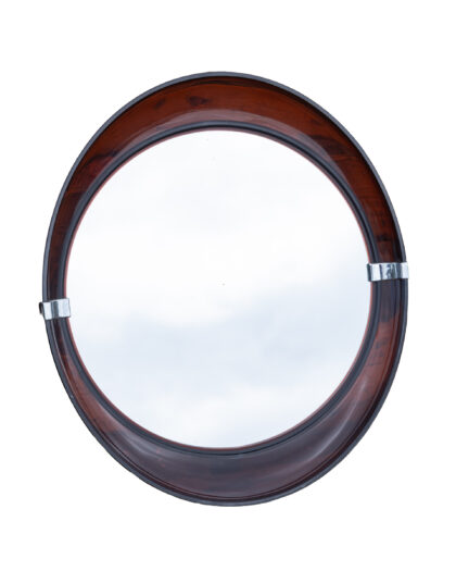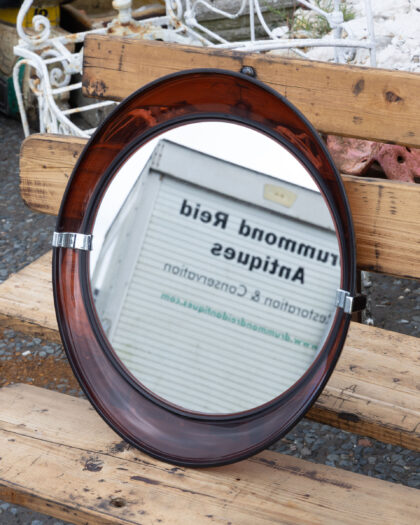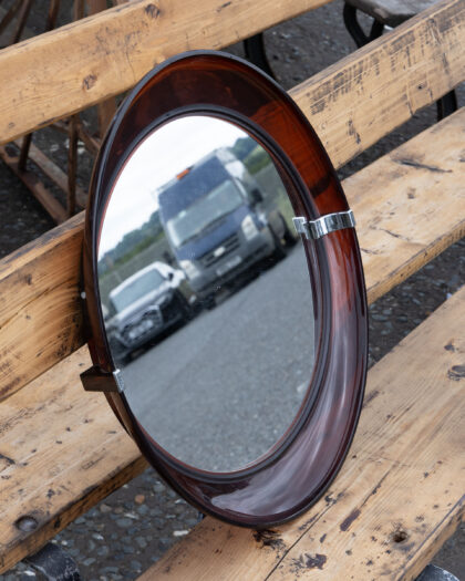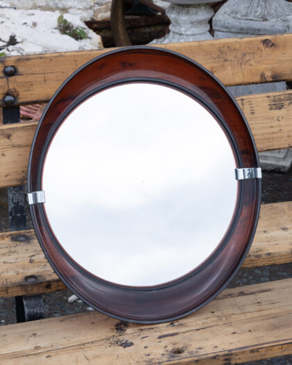 Modern round mirror featuring a unique deep red translucent plastic frame with sleek silver-tone accents, ready to hang.