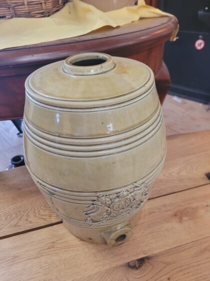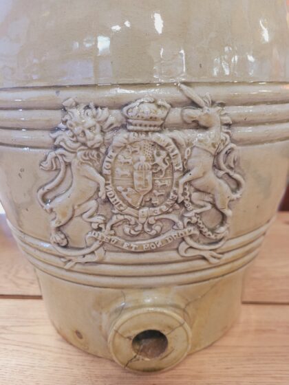 A green glazed stoneware decanter with extruded Royal emblem. Missing tap and lid.