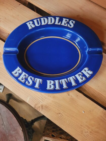 A blue glazed ceramic oval ashtray. Bears white lettering which reads, "Ruddles Best Bitter". Made by Castle Ceramics for Hancock Corfield and bears red backstamp to base.