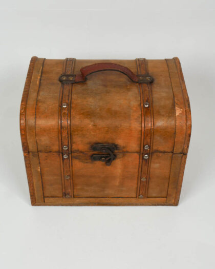 This is a small wooden storage trunk featuring a rustic design. The trunk is constructed from wood with a light brown finish, and the exterior is accented with metal hardware and leather straps. It has a lift-up lid and a secure clasp. The interior of the trunk is unfinished wood. It has a slightly aged appearance. The trunk shows some wear, including scuffs and scratches on the exterior and interior. It is sturdy and functional. This trunk could be used for storing small items in a living room, bedroom, or home office.