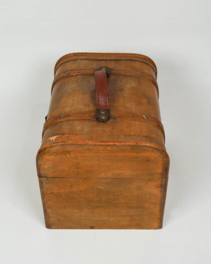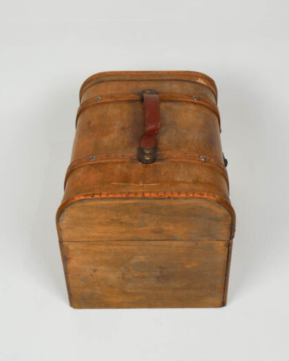 Wooden storage trunk with rustic metal hardware and a leather handle. Interior is unfinished wood. Some scuffs and wear. Sturdy construction.