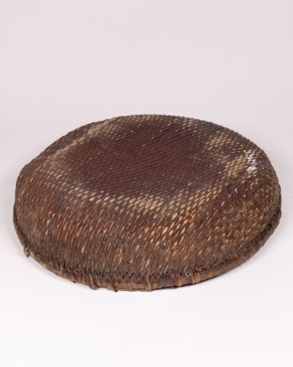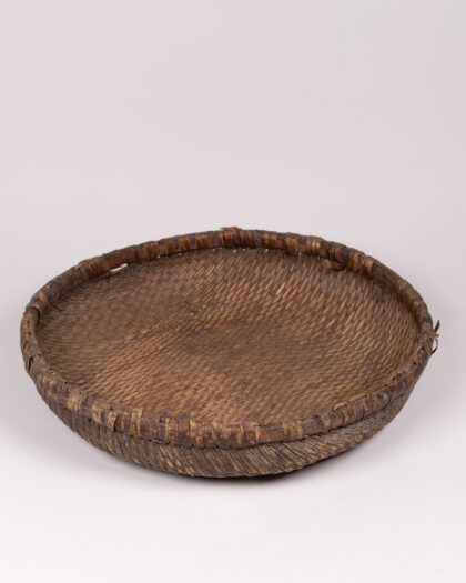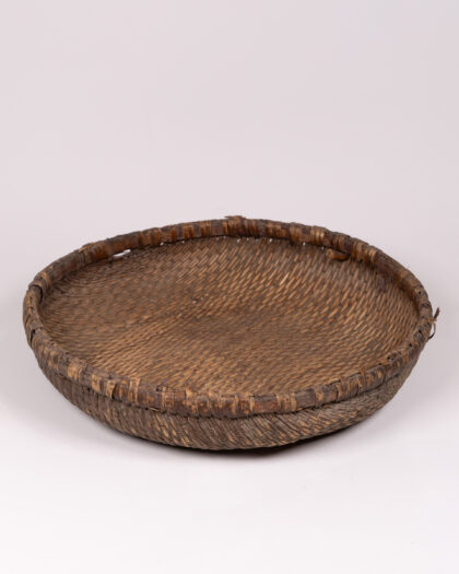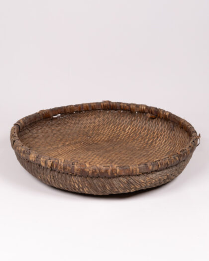 This is a woven bowl, likely originating from Asia. It is made from natural materials, possibly bamboo or rattan. The bowl features a woven pattern and a reinforced rim, which appears to be wrapped with additional material for added strength. The bowl has a shallow, wide shape, making it suitable for holding various items. This bowl would be at home holding fruit on a dining table or as a decorative object in a living room. Due to its age, the item has some imperfections, adding to its rustic charm. There are signs of wear on the rim and base, but overall the bowl is in good condition, considering its age and use.