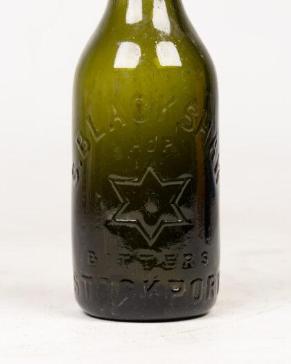 Vintage S. Blackshaw Hop Bitters bottle, crafted from green glass. Embossed with 'S. Blackshaw' above a prominent six-pointed star, and 'Bitters Stockport' below. The bottle features a distinct round stopper. Signs of wear and age are evident, adding to its vintage charm. Ideal for collectors of breweriana or antique glass bottles. 20cm high