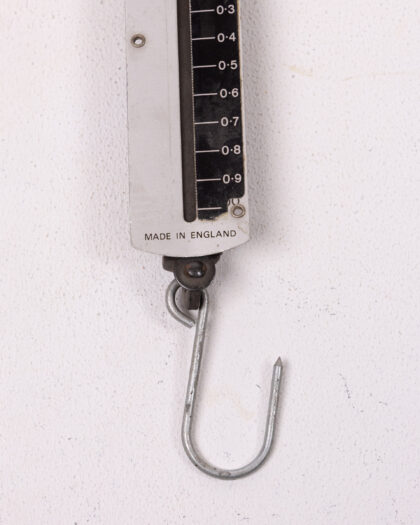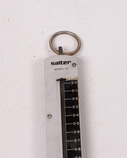 A Salter Model 10 weighing scale. These were made in England. This simple tool has a white casing with black scale markings. A metal ring at the top facilitates easy hanging, while a metal hook at the bottom allows for easy attachment of items to be weighed. This handy tool is an original and reusable weighing scale and would look great as part of a vintage tool or kitchenalia collection. It would make a good prop in a cafe or shop setting. The scale is showing some signs of age and use commensurate with age but is in good working order.