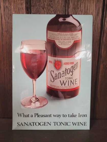 A Sanatogen Tonic Wine celluloid advertising sign. "What a Pleasant way to take Iron".