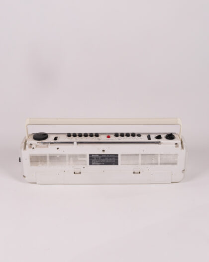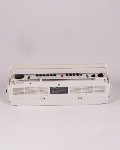 Vintage Sanyo M W12L radio cassette player. White plastic body with black speaker grills. Dual cassette decks. Good cosmetic condition. Untested.