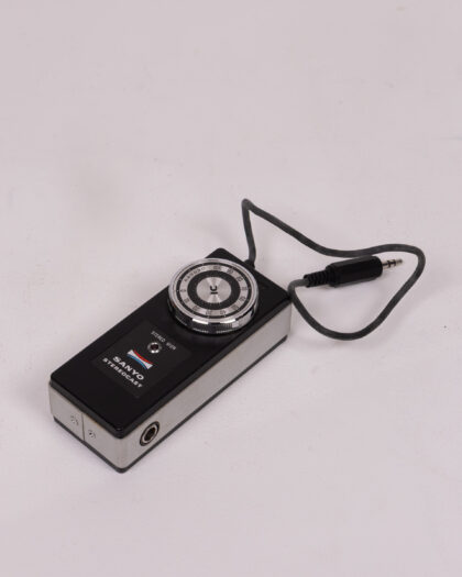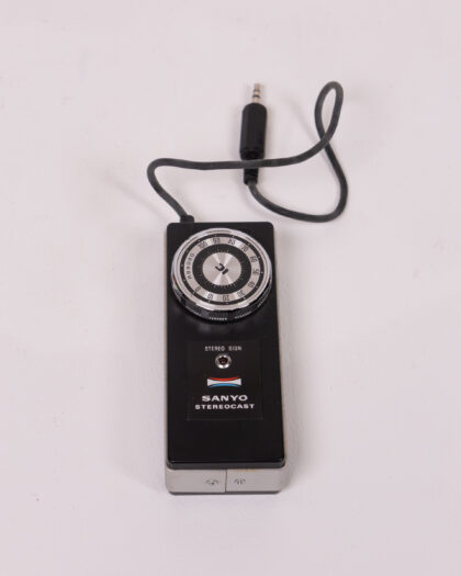This is a vintage Sanyo Stereocast radio. It has a black plastic case with a silver metal base. The tuning dial is at the top and marked with numbers. There is a red indicator light and the Sanyo logo on the front. Includes an attached black audio jack. This item is untested. This is a vintage piece.