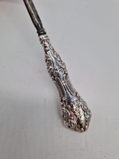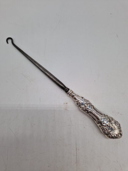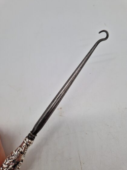 An antique button hook with a solid silver handle made by Henry Mathews Birmingham.