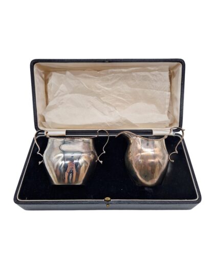 A solid silver milk jug and sugar bowl made by W. W. Griffith & Son with 1936 Birmingham hallmark.