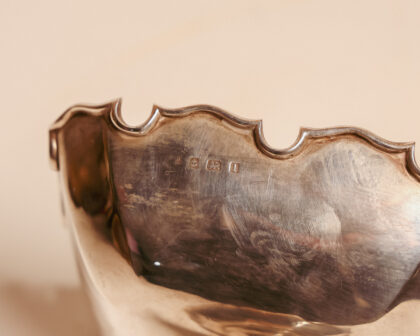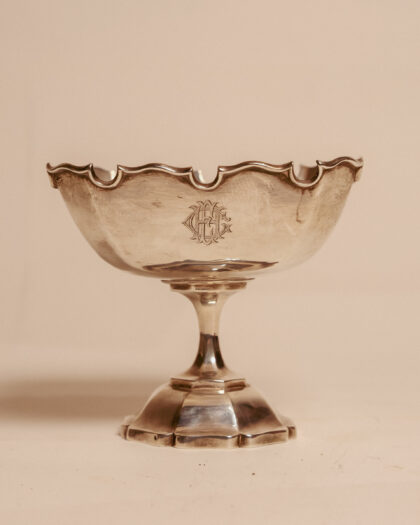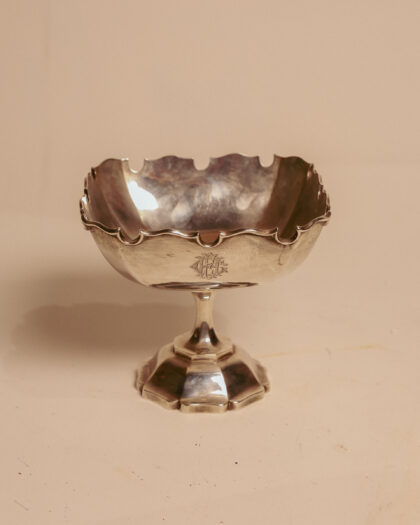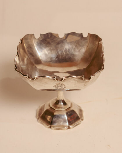 A monogrammed Sterling silver bowl on a pedestal with 1910 Birmingham assay marks. Unfortunately the maker's mark has been worn away at one side.