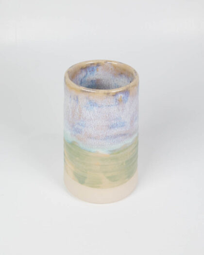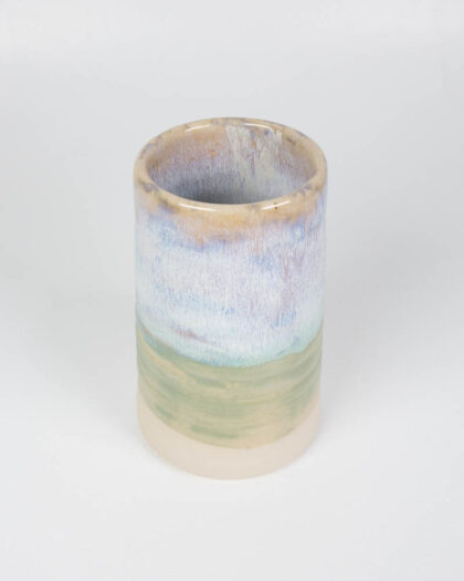 This is a brand new, large ceramic vase made by The School House Pottery. The vase has a cylindrical shape and features a glazed finish with blends of blue, green, and cream tones, creating a soft, blended effect. The upper portion transitions from a light blue to a creamy white, while the base has a subtle green hue. The interior is glazed in a warm, neutral tone that complements the exterior colours. The vase is in excellent condition. This piece would be ideal for displaying flowers or as a decorative accent in a living room, dining room, or bedroom.