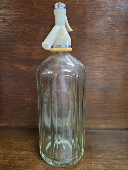 A clear glass soda syphon with cream coloured and metal top. Bears etched lettering which reads, "Trade Mark Schweppes By Appointment to Her Majesty the Queen Mineral Water Manufacturers Schweppes Ltd. A Coldflow Syphon".