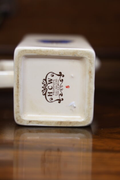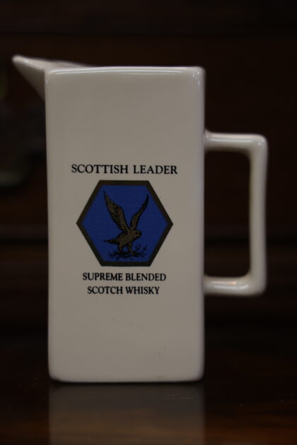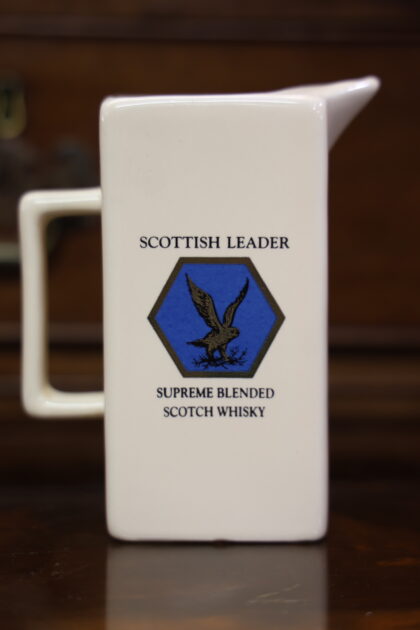 A white ceramic jug with black lettering which reads, "Scottish Leader Supreme Blended Scotch Whisky". Made by HCW and bears brown backstamp to base.
