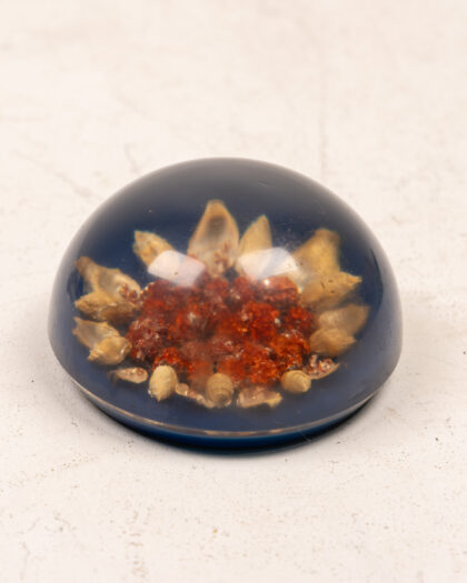 A vintage paperweight from Midton Crafts. This craftmade paperweight from Scotland features a botanical display, with dried orange and brown botanicals encased in clear resin. The base is a solid dark blue. A lovely addition to a vintage collection. The item is in good condition overall. There is a Midton Crafts sticker on the base.