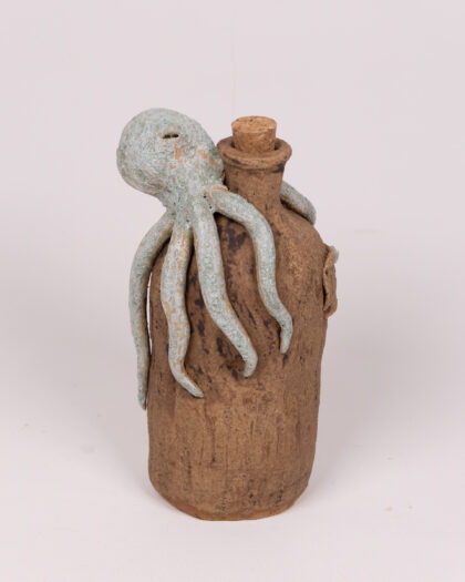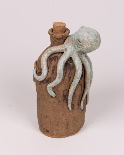 Unique hand-crafted ceramic bottle sculpture featuring a pale green octopus clinging to the side, complete with a cork stopper.
