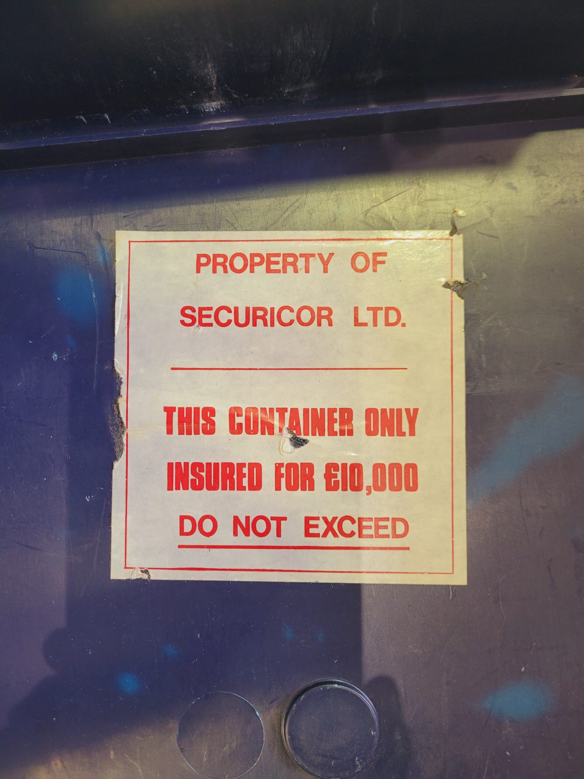 An original blue plastic Securicor cash-in-transit security box.