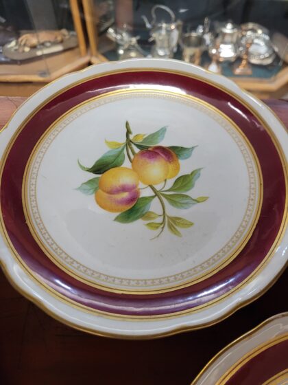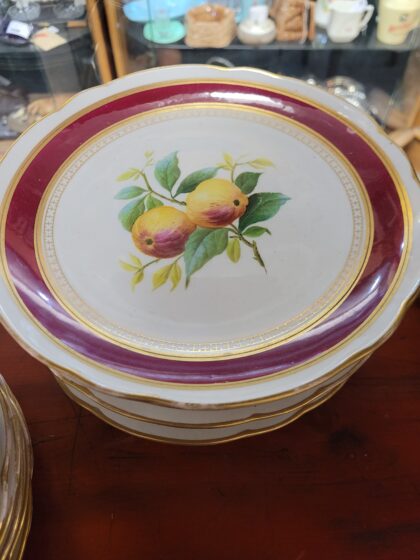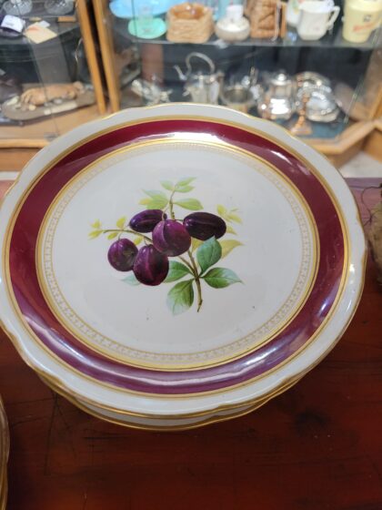18 plates and 3 raised plates, most have different pictures painted and gilt edges.