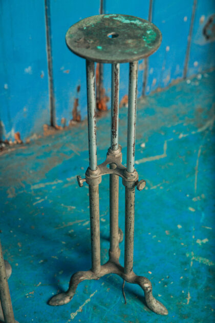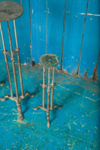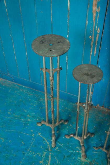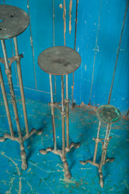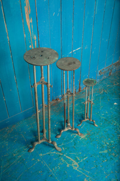 This a set of 3 brass vintage display stands from a shop. They have been painted.