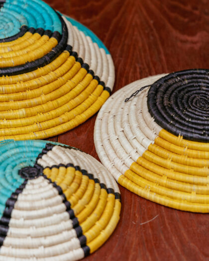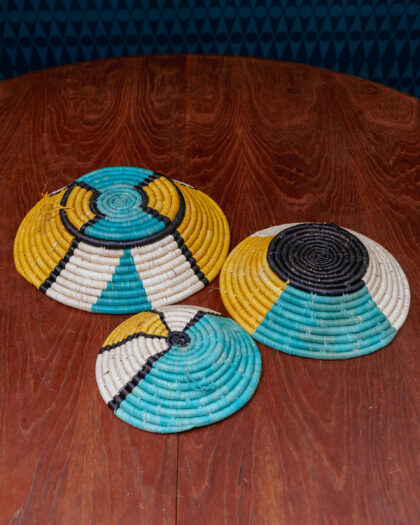 Boasting linear, geometric designs in black, light aqua, peach and mustard yellow, these stylish wall platters are all handcrafted in the Gulu region of Uganda. The weavers in this group are all former child-soldiers and single mothers who have lived through Uganda’s twenty-year war with the LRA. These artisans have been trained in jewellery-making and basket weaving, the latter of which is now their main income stream.