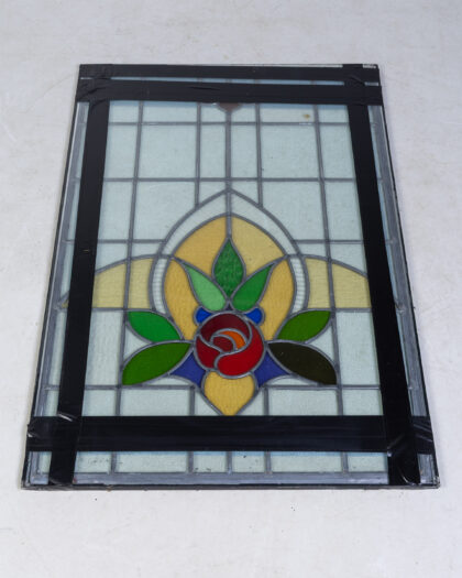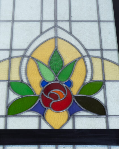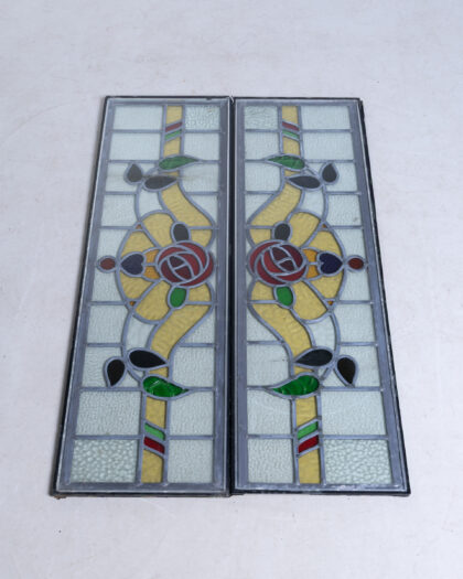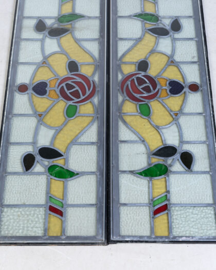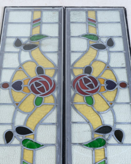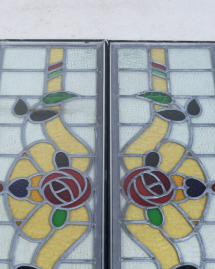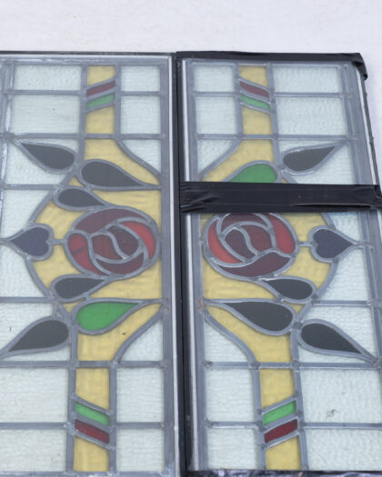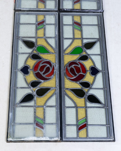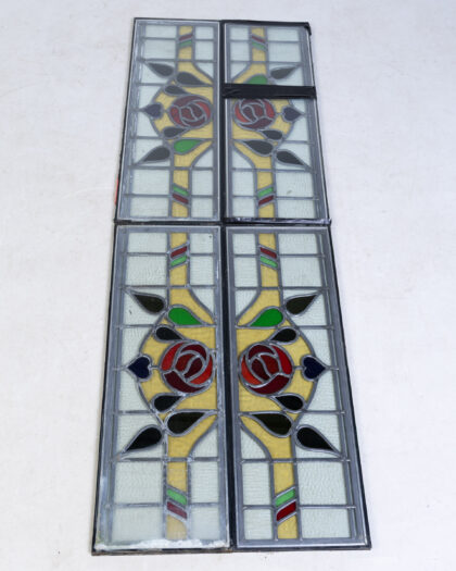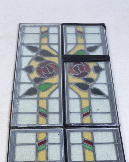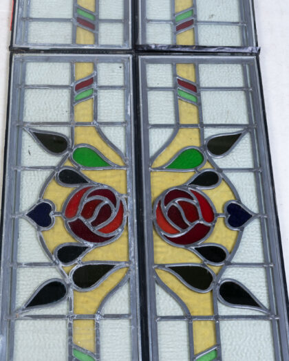 Set of four salvaged stained glass door panels. Featuring a red rose floral design with yellow and green accents. Great decorative pieces.
