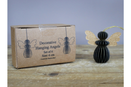 Elegant set of six black angel ornaments, perfect for decorating your home or tree. Each angel features intricate golden wings and is crafted with care.