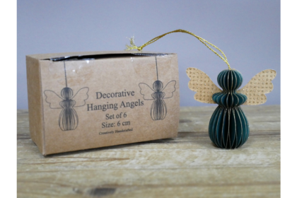 This charming set of 6 green angel ornaments features delicate gold wings, perfect for adding a touch of elegance to your holiday decor. Each angel measures H: 6cm, W: 7cm, D: 4cm and weighs 0.08kgs. Ideal for hanging on Christmas trees or as decorative accents around your home.