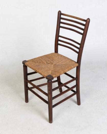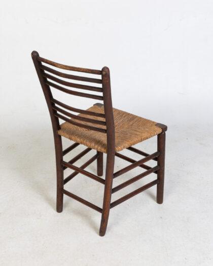This is a set of six vintage ladderback dining chairs, each featuring a woven rush seat and a dark wood frame. The chairs showcase a classic, rustic style, perfect for adding a touch of country charm to any dining space. The ladderback design adds visual interest, while the rush seats offer comfortable seating. The chairs are in good vintage condition, showing signs of wear consistent with age. They would make a great addition to your dining set or a standalone decorative item. They also come with a set of floral seat covers which tie on at the back.