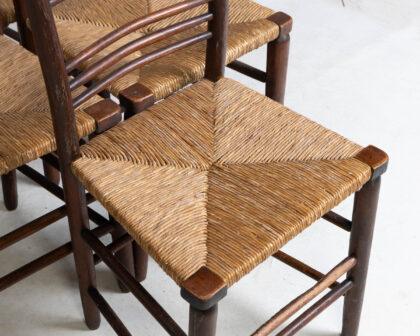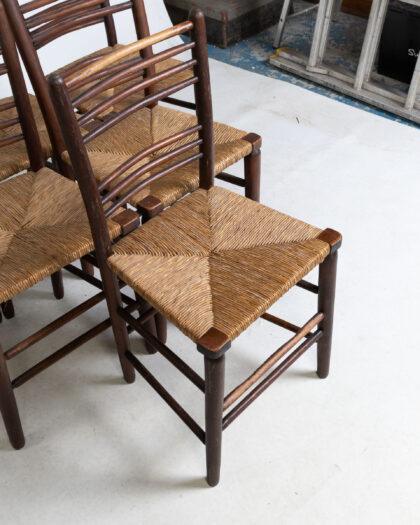Set of six vintage ladderback dining chairs with woven rush seats and dark wood frames. Classic country style in good vintage condition.