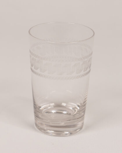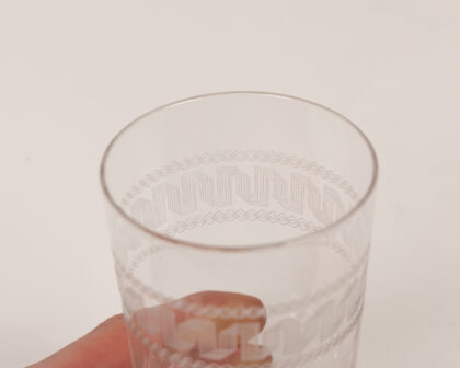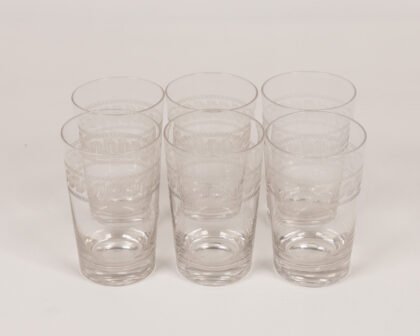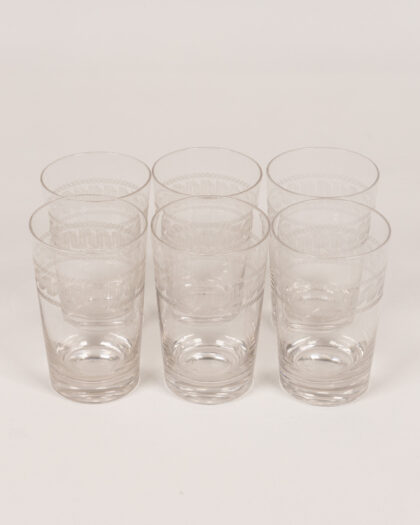 Elegant set of six vintage glass tumblers with etched geometric design. Perfect for adding a touch of retro style to your barware collection.