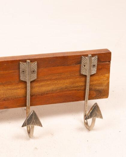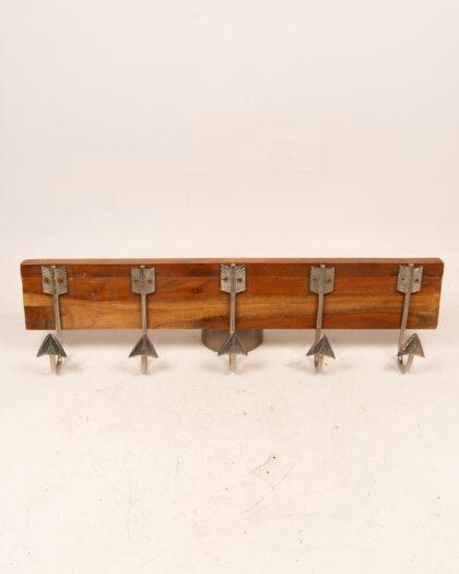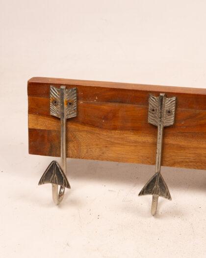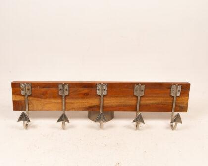 Vintage coat rack featuring five arrow-shaped metal hooks mounted on a wooden base. Stylish and functional wall storage solution.