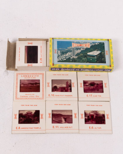 Capture a nostalgic glimpse into the past with this charming vintage "Longevity Colour Slides" set, originating from Hong Kong's New Territories. This delightful set includes 20 high-quality colour slides showcasing iconic landmarks and scenic views of Hong Kong. The set features slides of Kat Hing Wai, Man Fat Pagoda, Kam Tin, Green Pine Temple, Village NT and Altar. The slides are in good condition for their age, though the box shows signs of wear and tear. A lovely piece of photographic history and a unique travel souvenir.
