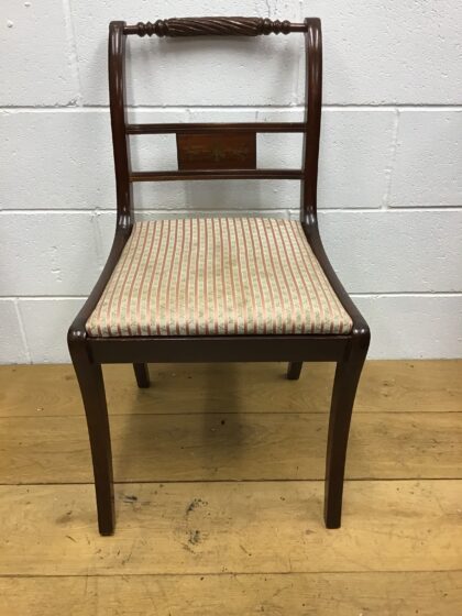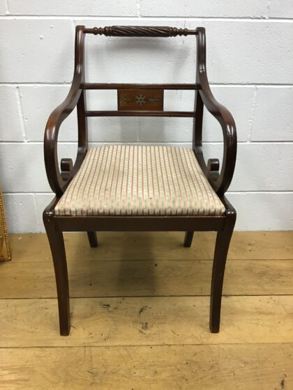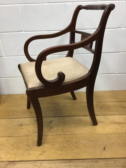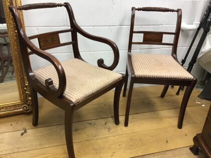 Set of six carved mahogany dining chairs. Two carvers and four regular. 85cm height, 50cm wide, 58cm deep, 45cm seat height. A lovely set to take home today or get them reupholstered in-store in your own choice of fabric.