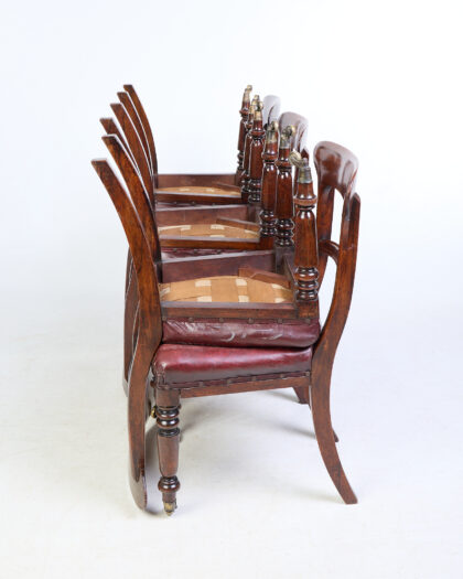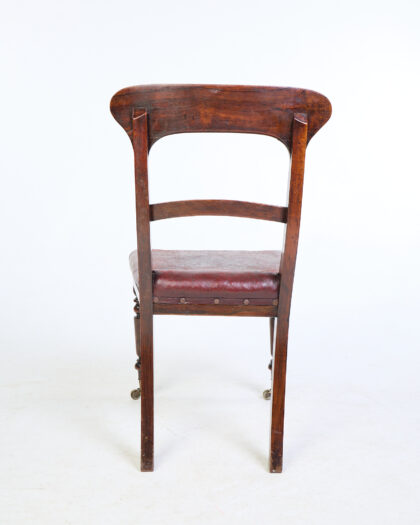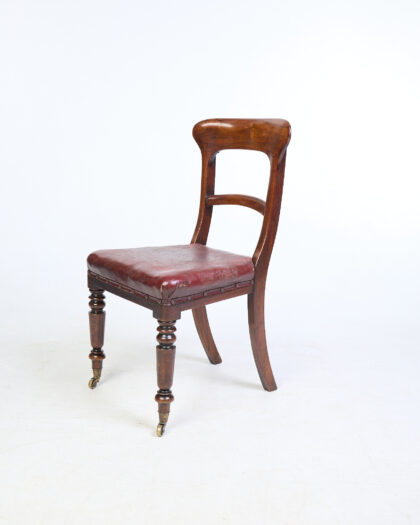 This is a set of six vintage rosewood dining chairs featuring a red leather seat with brass studding detail. The chairs have a classic design with a curved backrest, turned legs and brass castor wheels. The leather seats shows signs of wear and age. The mahogany wood has a rich, warm tone and a visible grain. The chairs are sturdy and in good overall condition, suitable for use in a dining room.