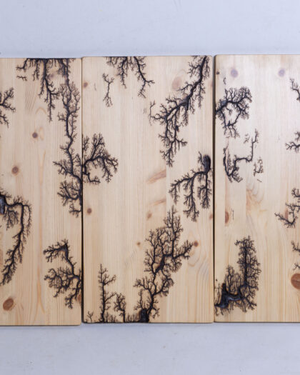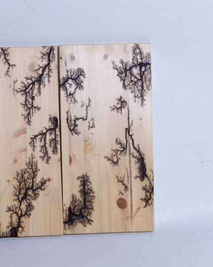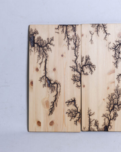 Unique fractal wood art featuring a Lichtenberg figure design. A captivating blend of natural wood and intricate, burned patterns.