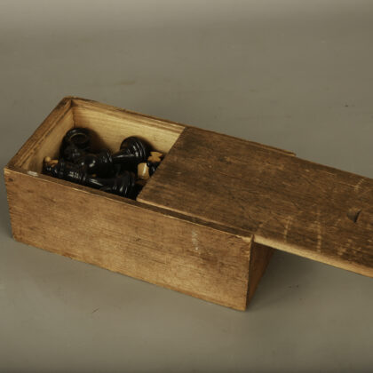 A complete set of vintage wooden chess pieces in a small wooden box.