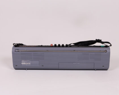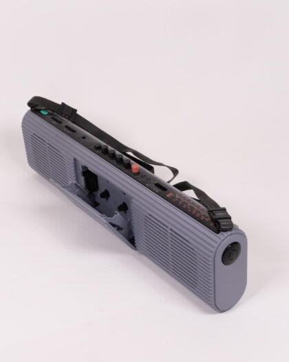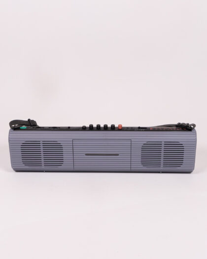 This is a SHARP Stereo Radio Cassette Recorder. The body is mainly grey with black controls and trim. The recorder has a telescopic antenna. There is a carry strap attached to the sides. This item has wear consistent with age and use. It is in good vintage condition, with only some slight damage to the cassette door.